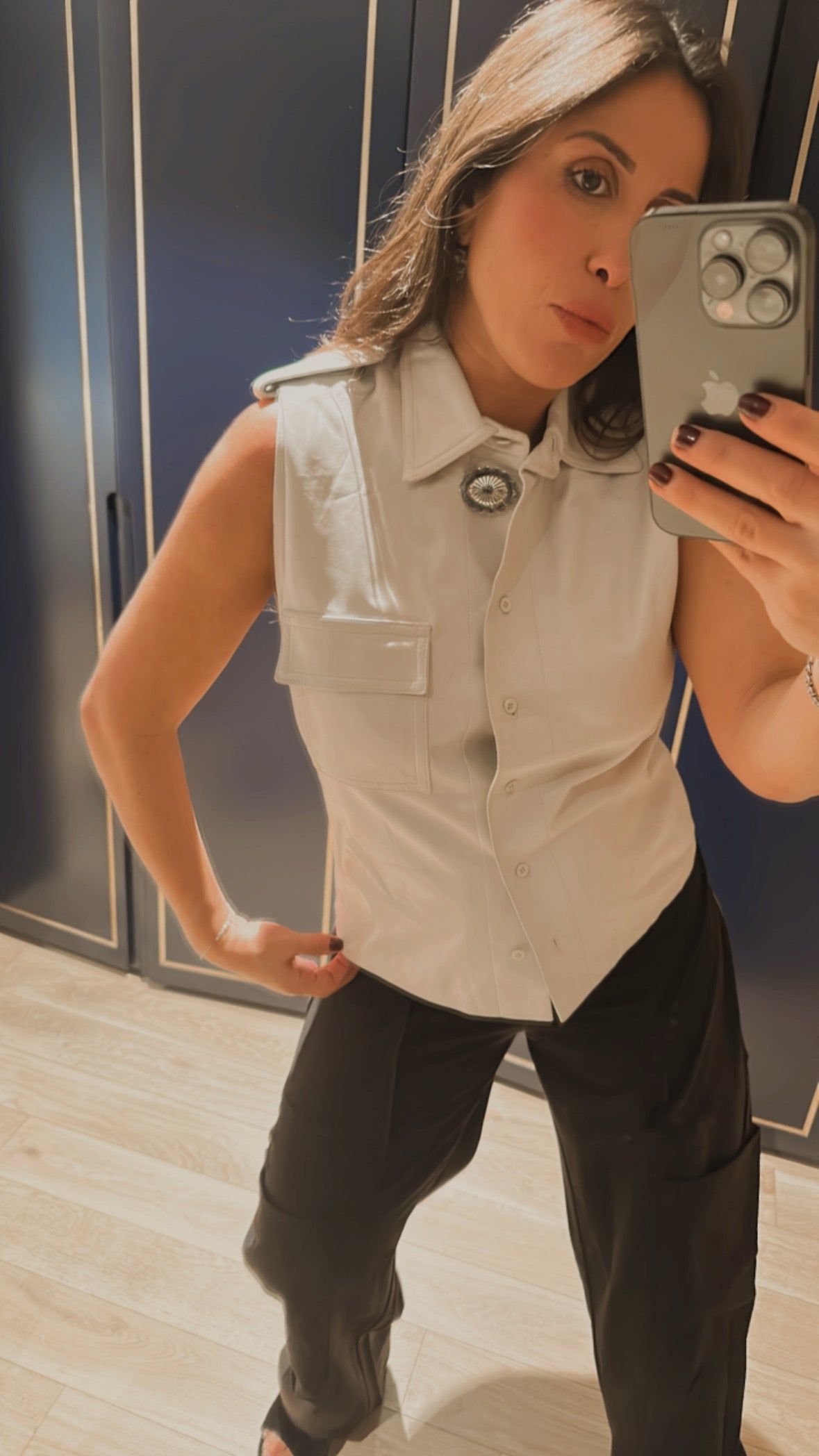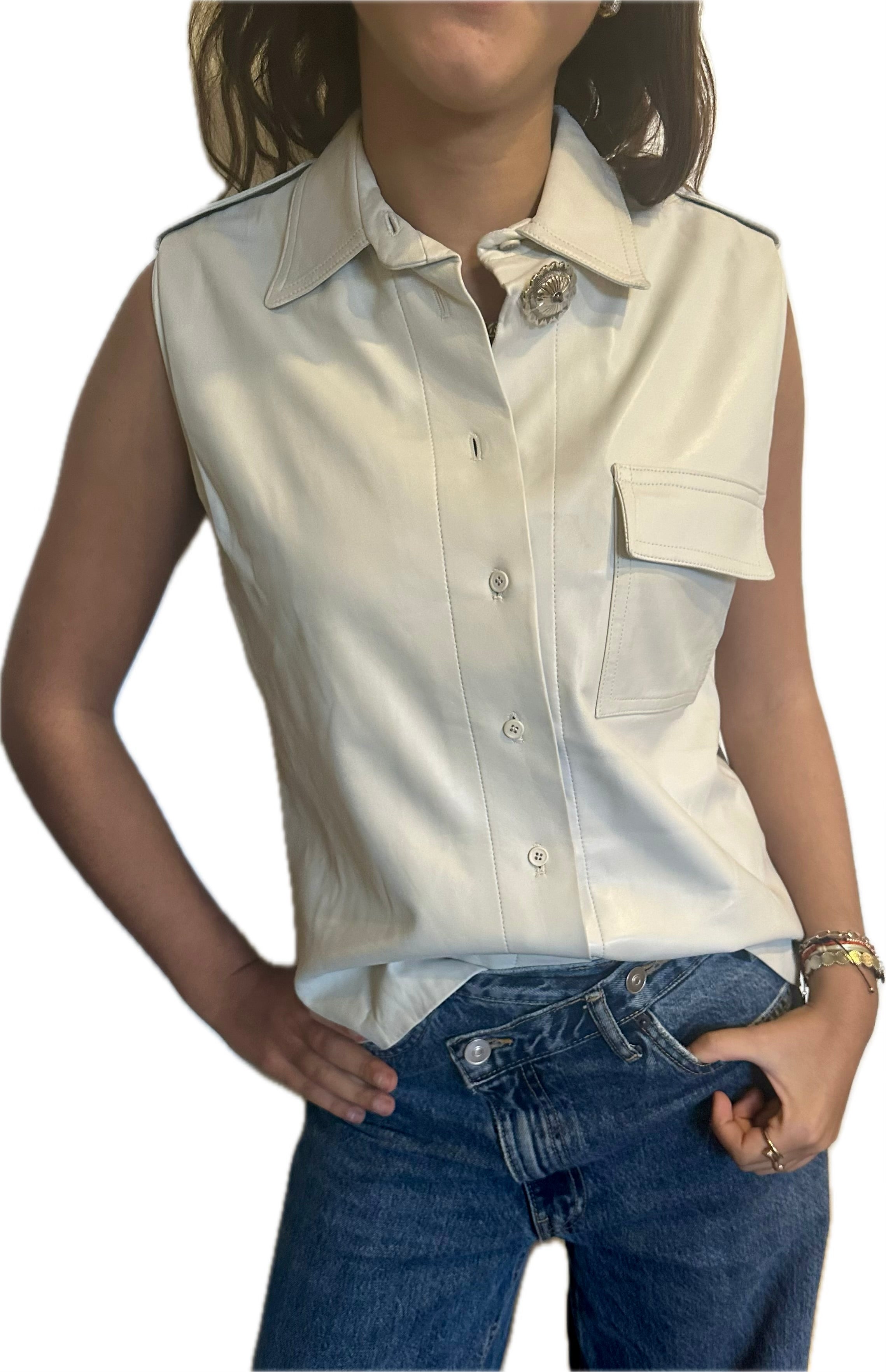 Cette veste sans manches en cuir blanc cassé incarne à la fois l’élégance intemporelle et le style contemporain. Son design minimaliste est sublimé par une customisation unique, apportant du caractère à cette pièce de créateur.