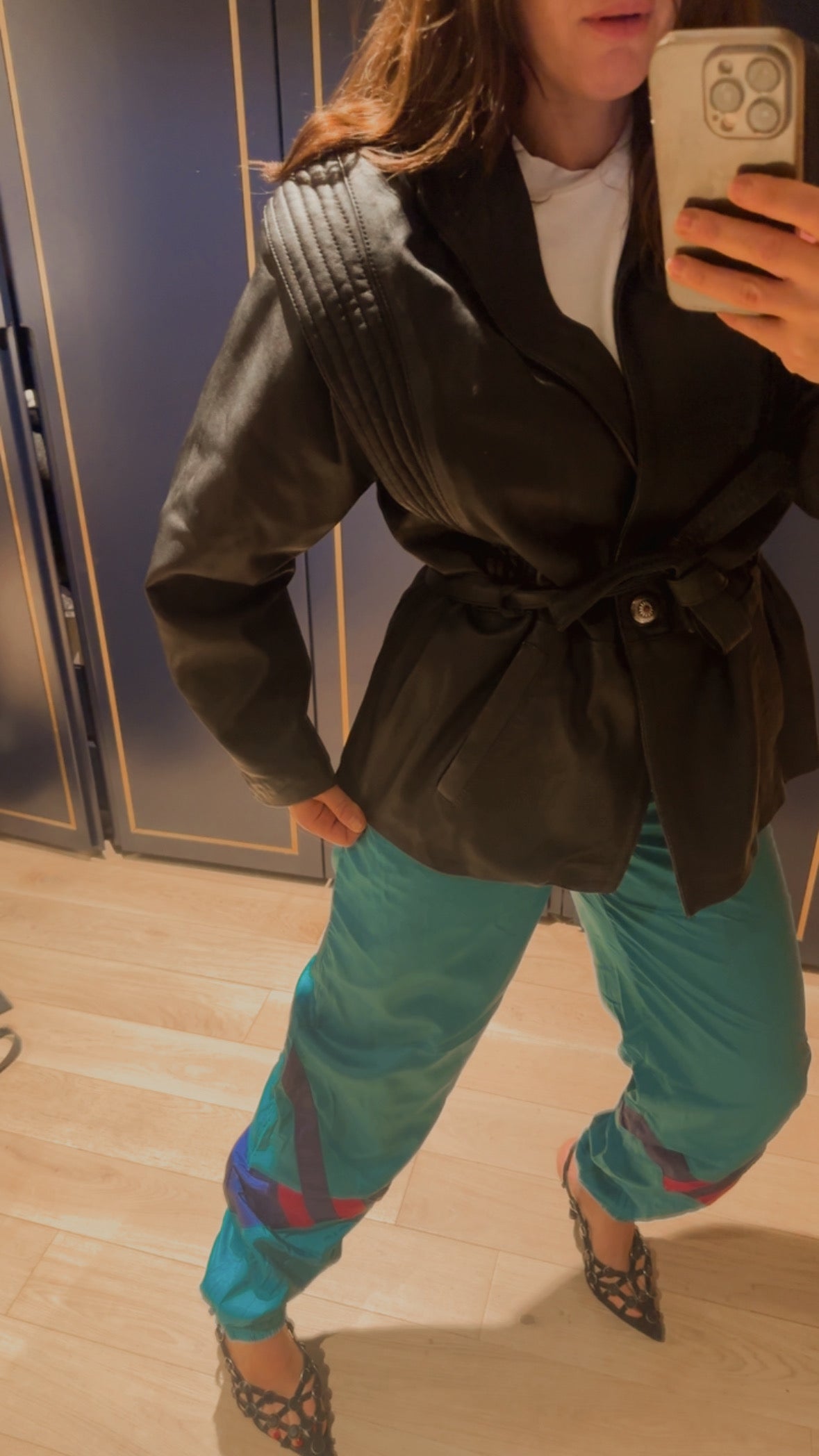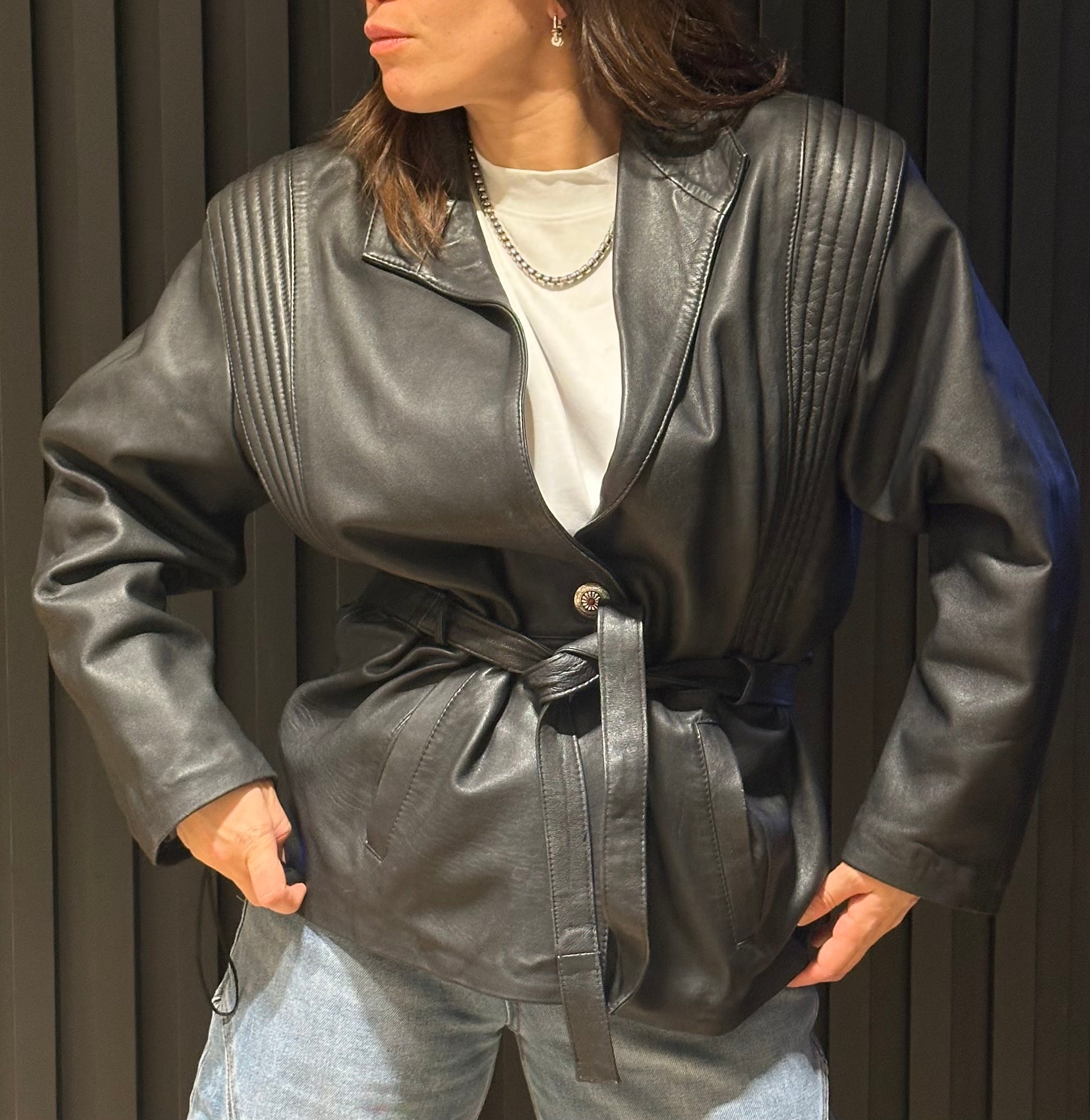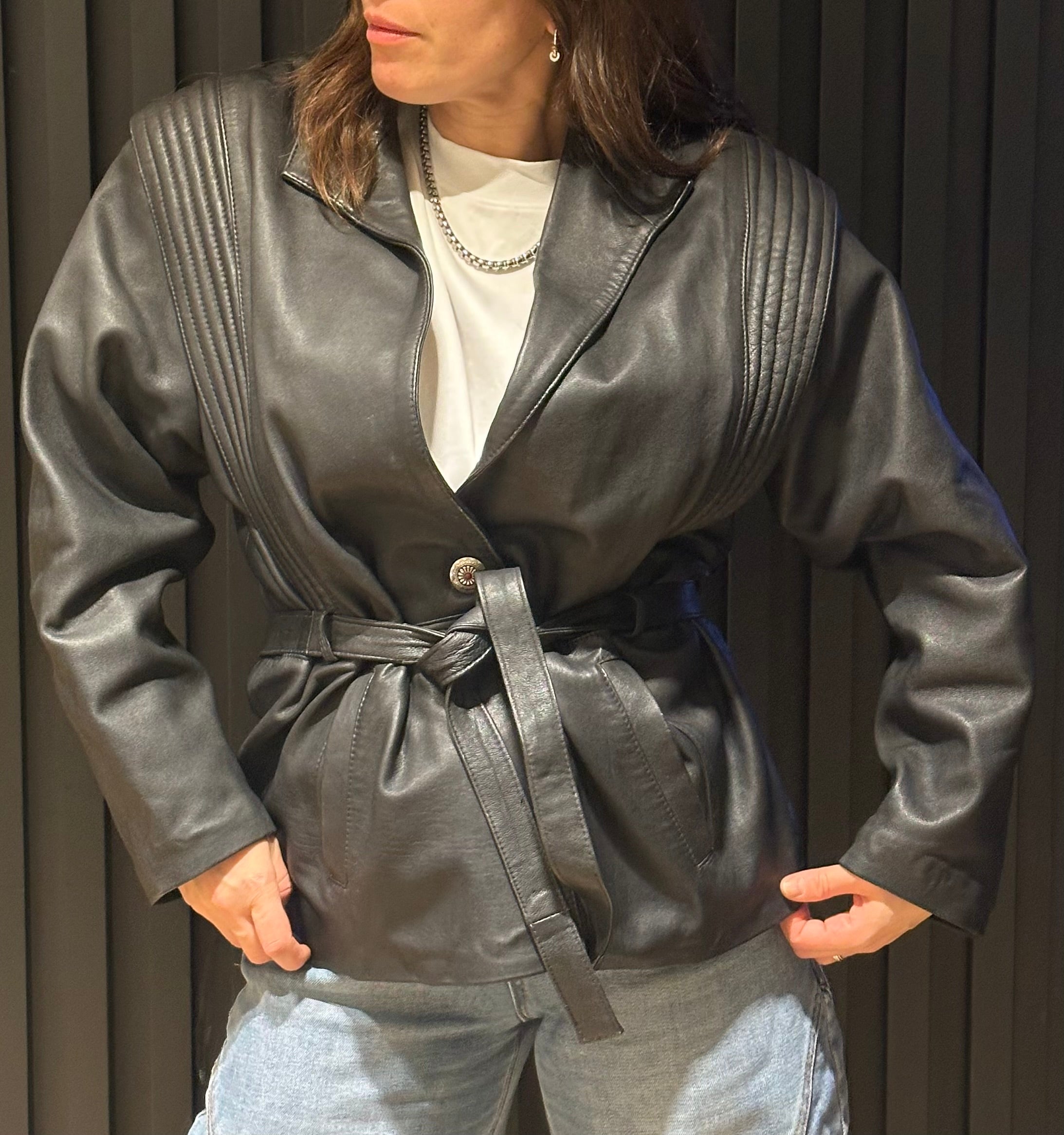 Superbe veste vintage en cuir véritable noir, à la coupe élégamment structurée et féminine.