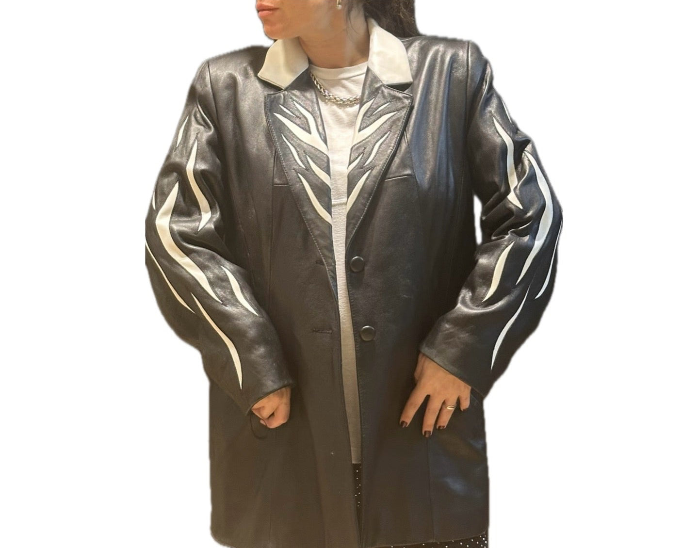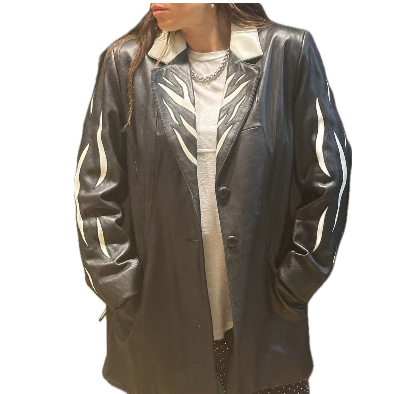 Pièce ultra stylée et rare, cette veste vintage en cuir véritable joue sur le contraste du noir et du blanc avec un imprimé ZEB audacieux sur le devant et les manches. Son design unique évoque les silhouettes fortes des années 90–2000, parfait pour un look affirmé et mode.