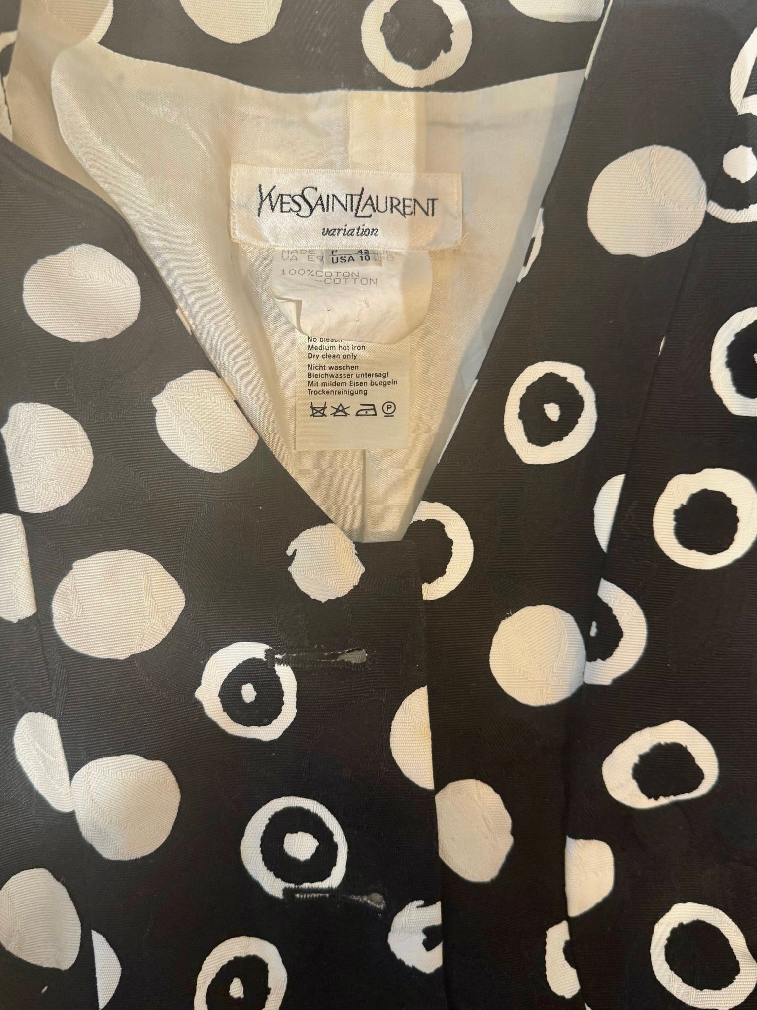 Cette veste vintage Yves Saint Laurent, en taille 38, est une pièce unique qui se distingue par son motif à pois original.